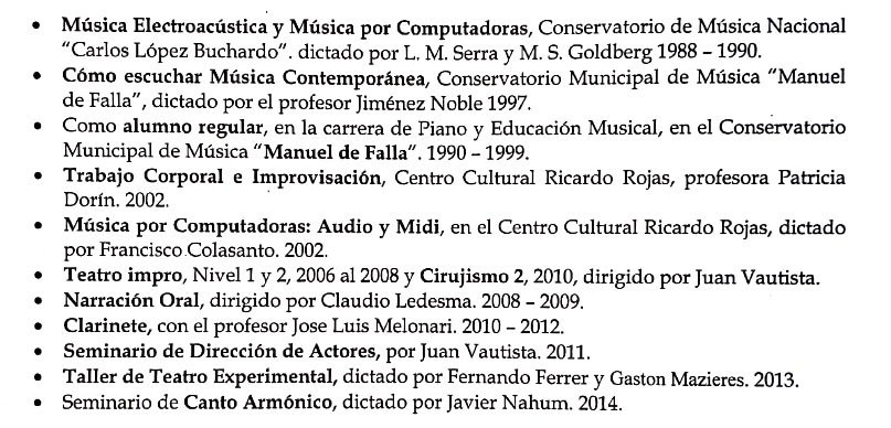 Títulos Obtenidos: - Profesor Elemental y Normal de Piano. - Profesor de Teoría y Solfeo. Antiguo Conservatorio de Música Beethoven, 1989, 1990 y 1993 (CABA)